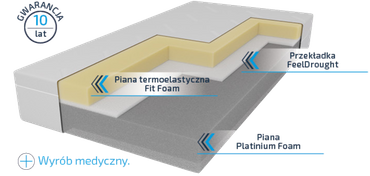 Podstawą materaca jest aż 24 cm wysokoelastycznej piany Platinum Foam, odpowiadającej najwyższej klasy materacom sprężynowym. Wierzchnia warstwa składa się z 8 cm piany termoelastycznej Fit Foam reagującej na ciepłotę ludzkiego ciała. Dodatkowo materac wyposażony jest w przekładkę FeelDrought. Grubość materaca i specjalnie dobrana gęstość pian, czyni go wyjątkowo komfortowym.